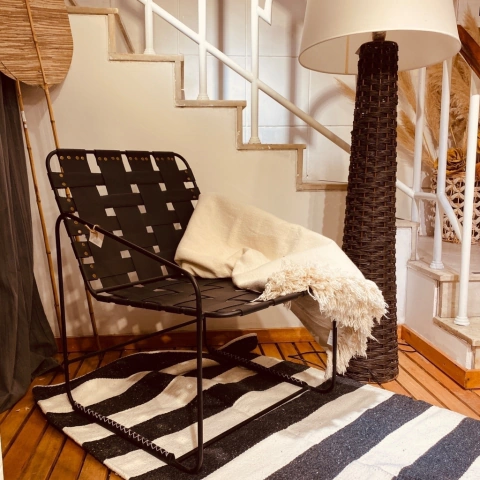 Sillón individual de hierro pintado color negro con trenzado de cuero.